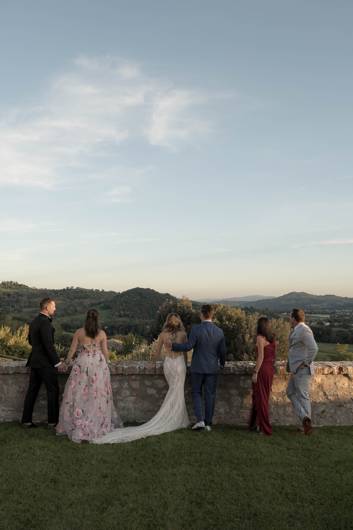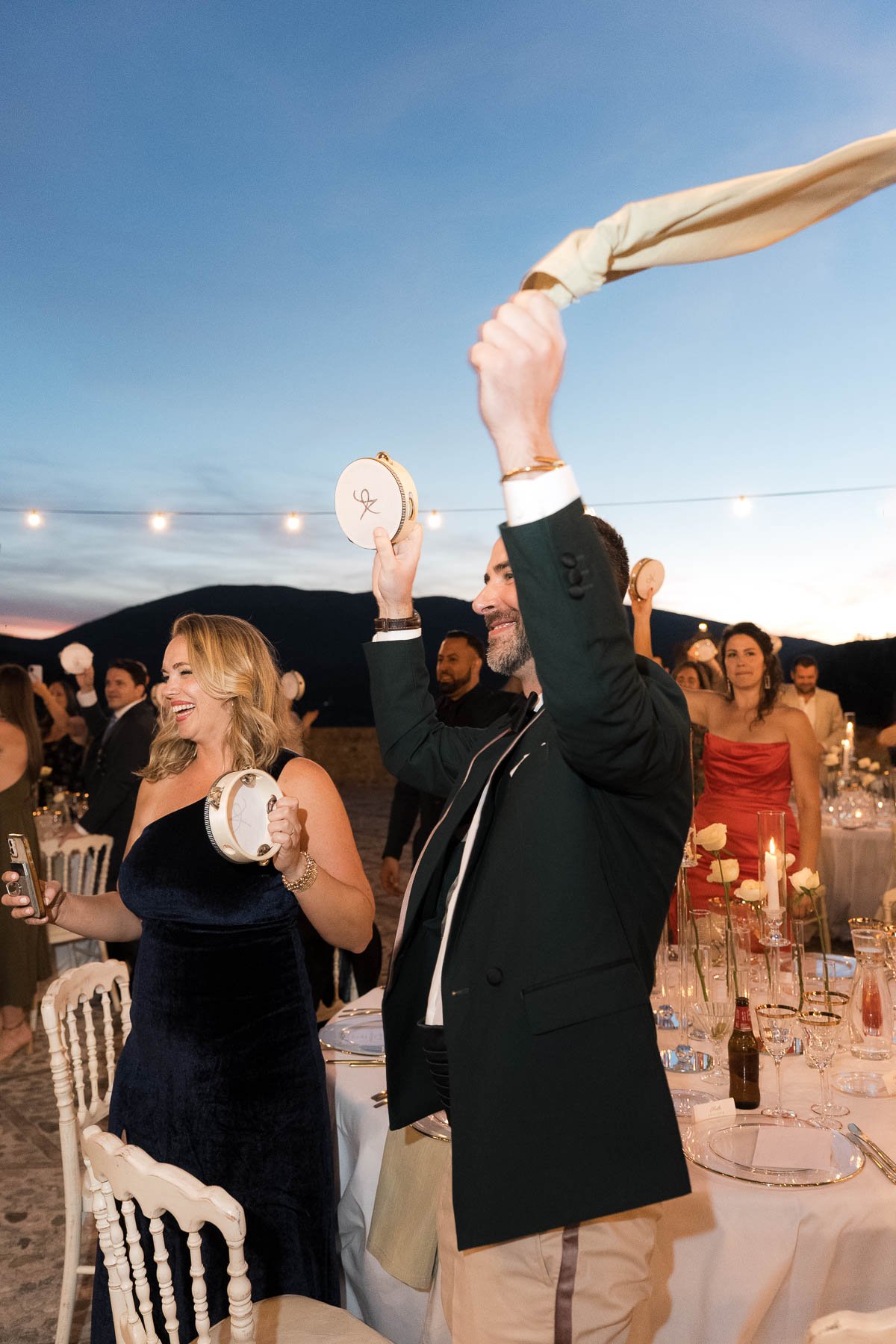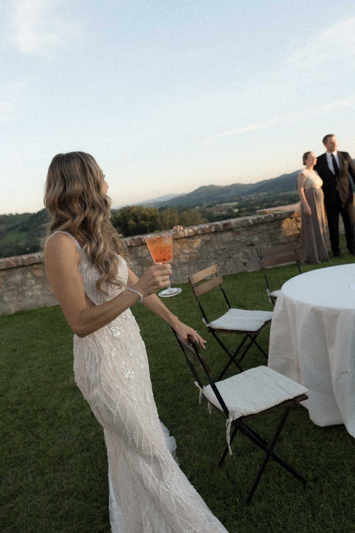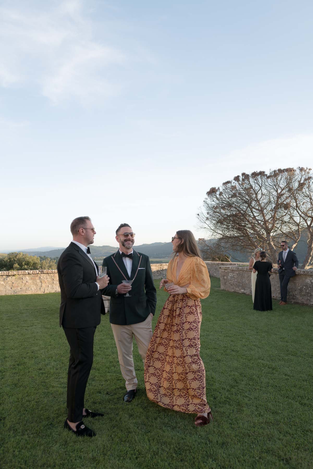As the ceremony transitioned into aperitivo, the energy of the day expanded rather than dispersed. Guests gathered easily, conversations flowed, and laughter echoed through the open spaces of the castello. No one felt pulled away or rushed. Ali and Adam moved through the celebration together, present with their guests, fully immersed.
