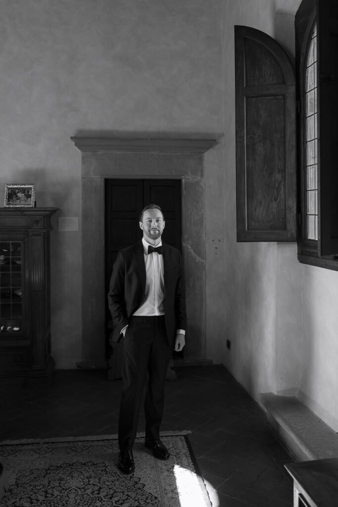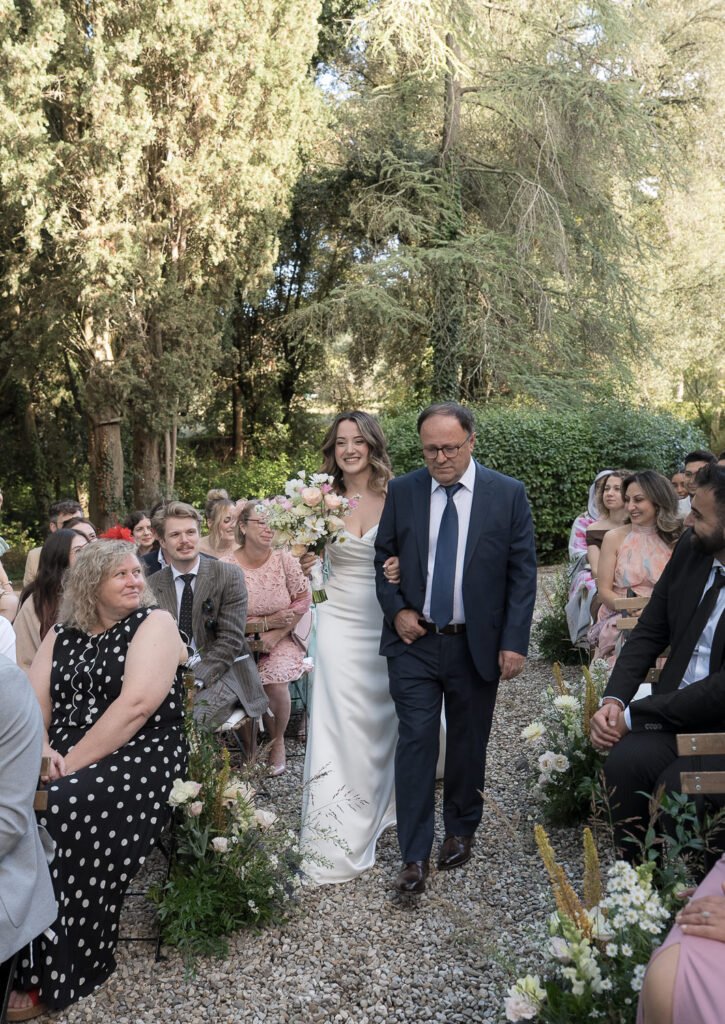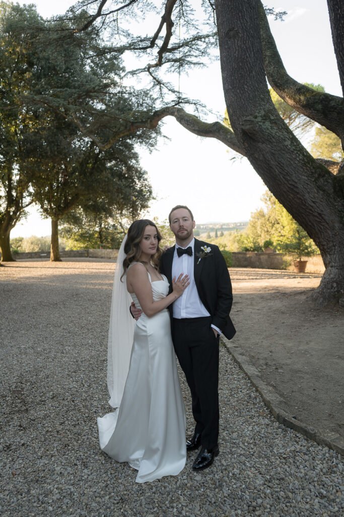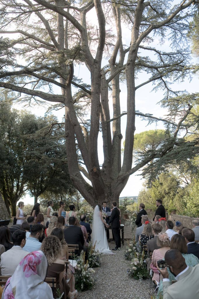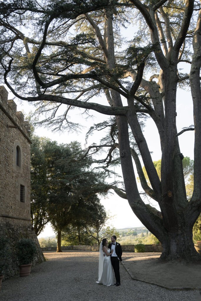 Castello Il Palagio proved to be an ideal location for a civil wedding in Tuscany. The gardens offered privacy, while the historic architecture provided a strong sense of place without overwhelming the event. The Lebanese cedar tree, in particular, became a central part of the story, giving the ceremony a clear focal point and a sense of continuity.