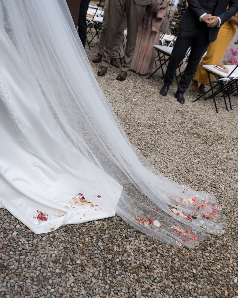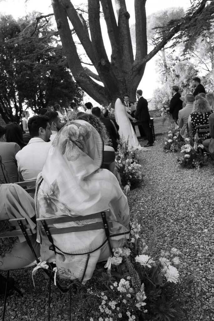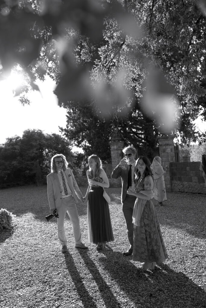 The couple held a civil ceremony in the garden of Castello Il Palagio, under a remarkable hundred-year-old Lebanese cedar tree. The setting was simple and meaningful. The tree offered natural shade and a strong sense of presence, creating a quiet space where everyone could focus on the moment. There was no distance between the couple and their guests. Everyone stood close, making the ceremony feel intimate and sincere.