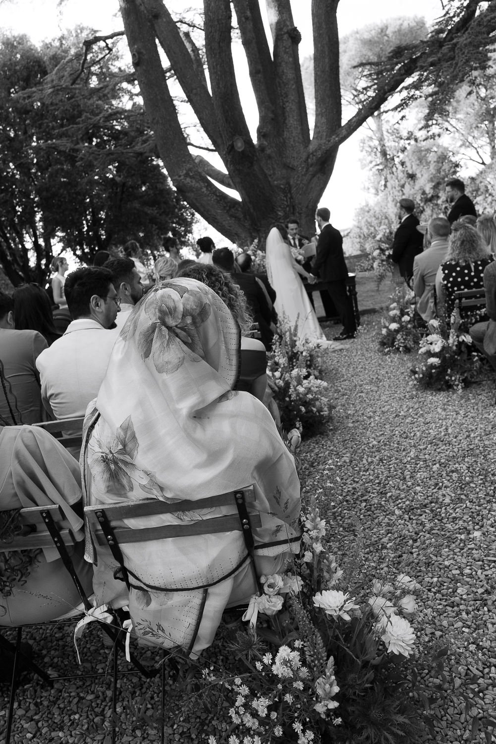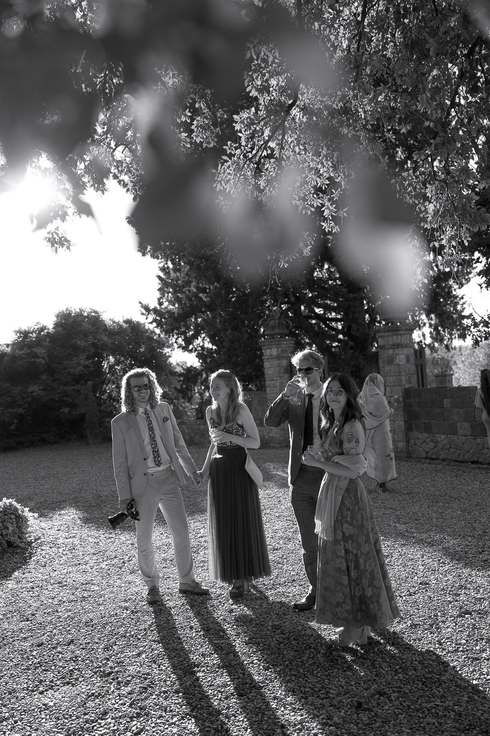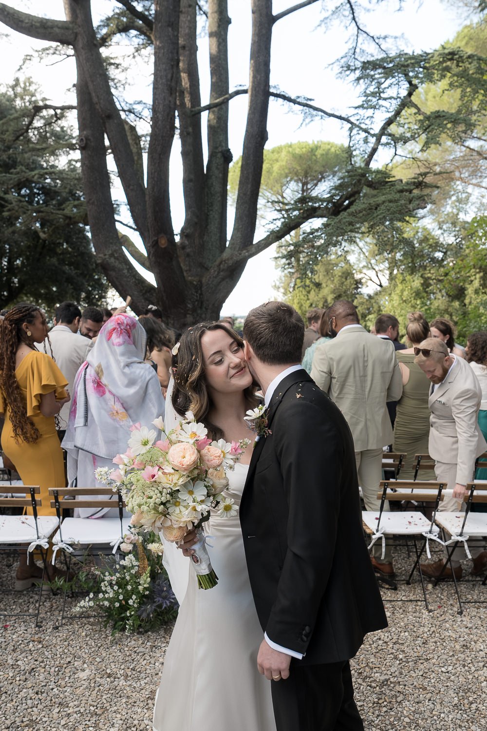 La coppia ha celebrato una cerimonia civile nel giardino del Castello Il Palagio, sotto un maestoso cedro del Libano secolare. La cornice era semplice ma ricca di significato. L’albero offriva ombra naturale e una forte presenza scenica, creando uno spazio raccolto in cui tutti potevano concentrarsi su quel momento. Non c’era distanza tra gli sposi e gli invitati: tutti erano vicini, rendendo la cerimonia intima, sincera e profondamente partecipata.
