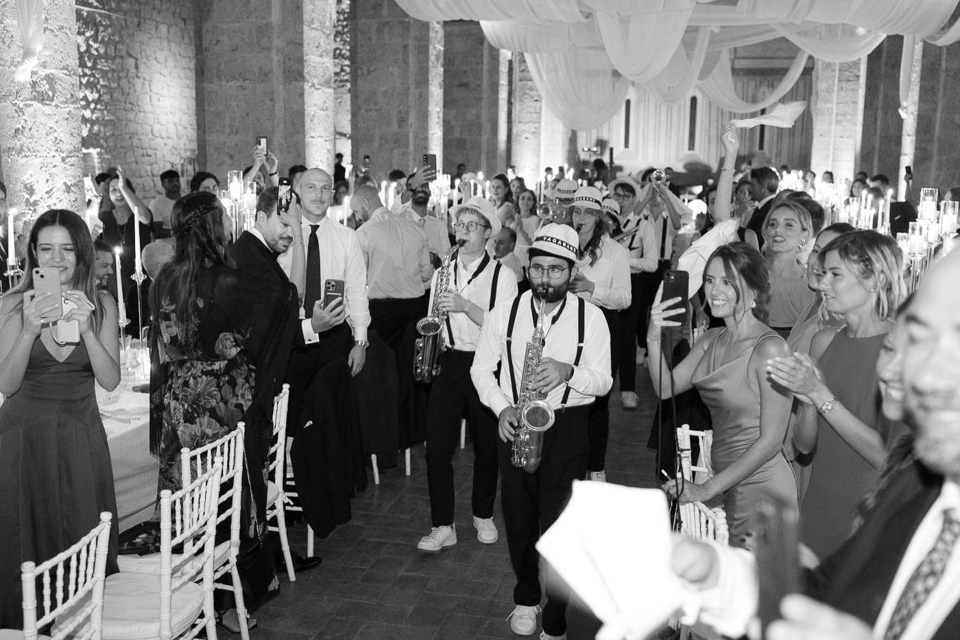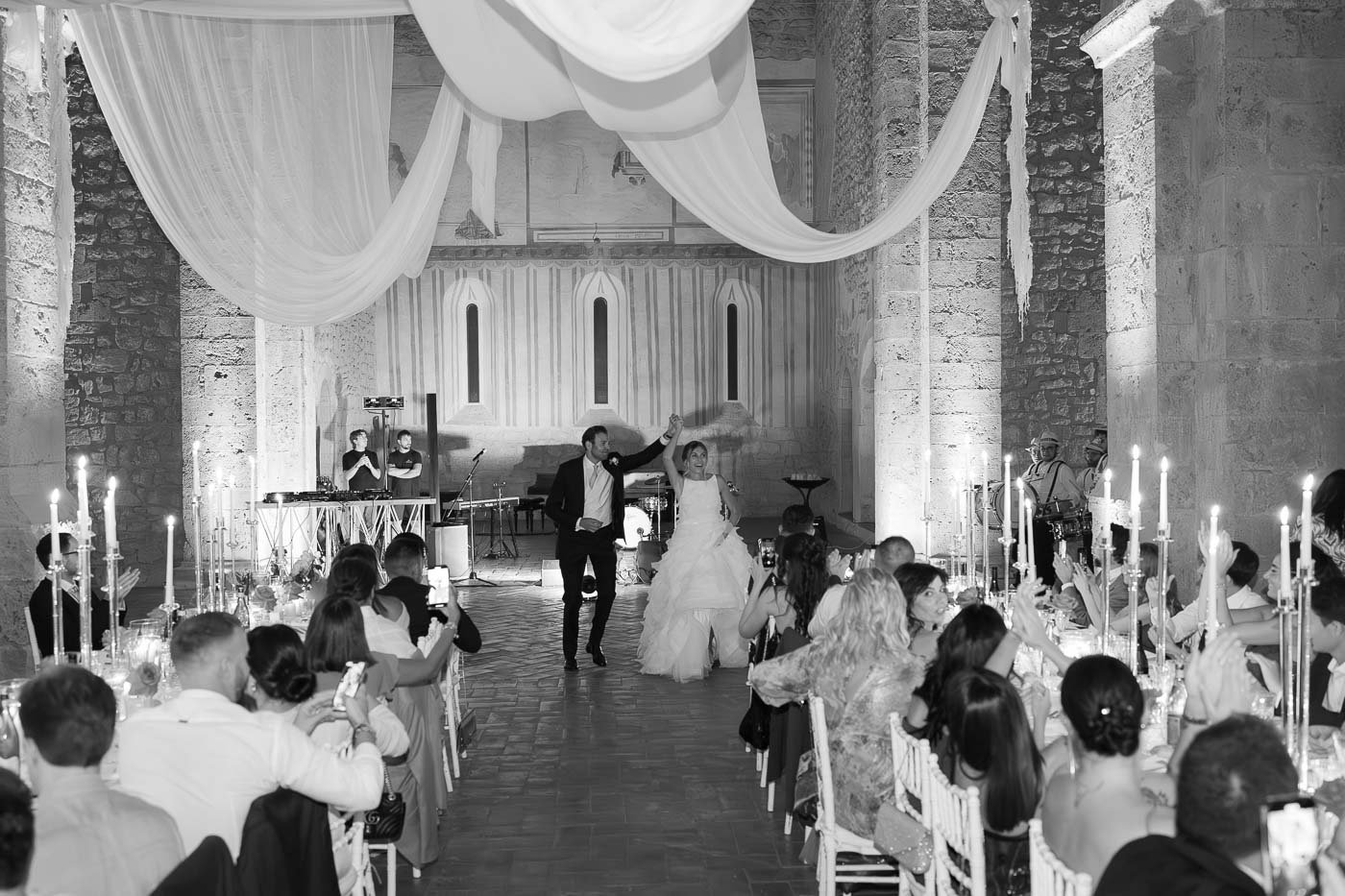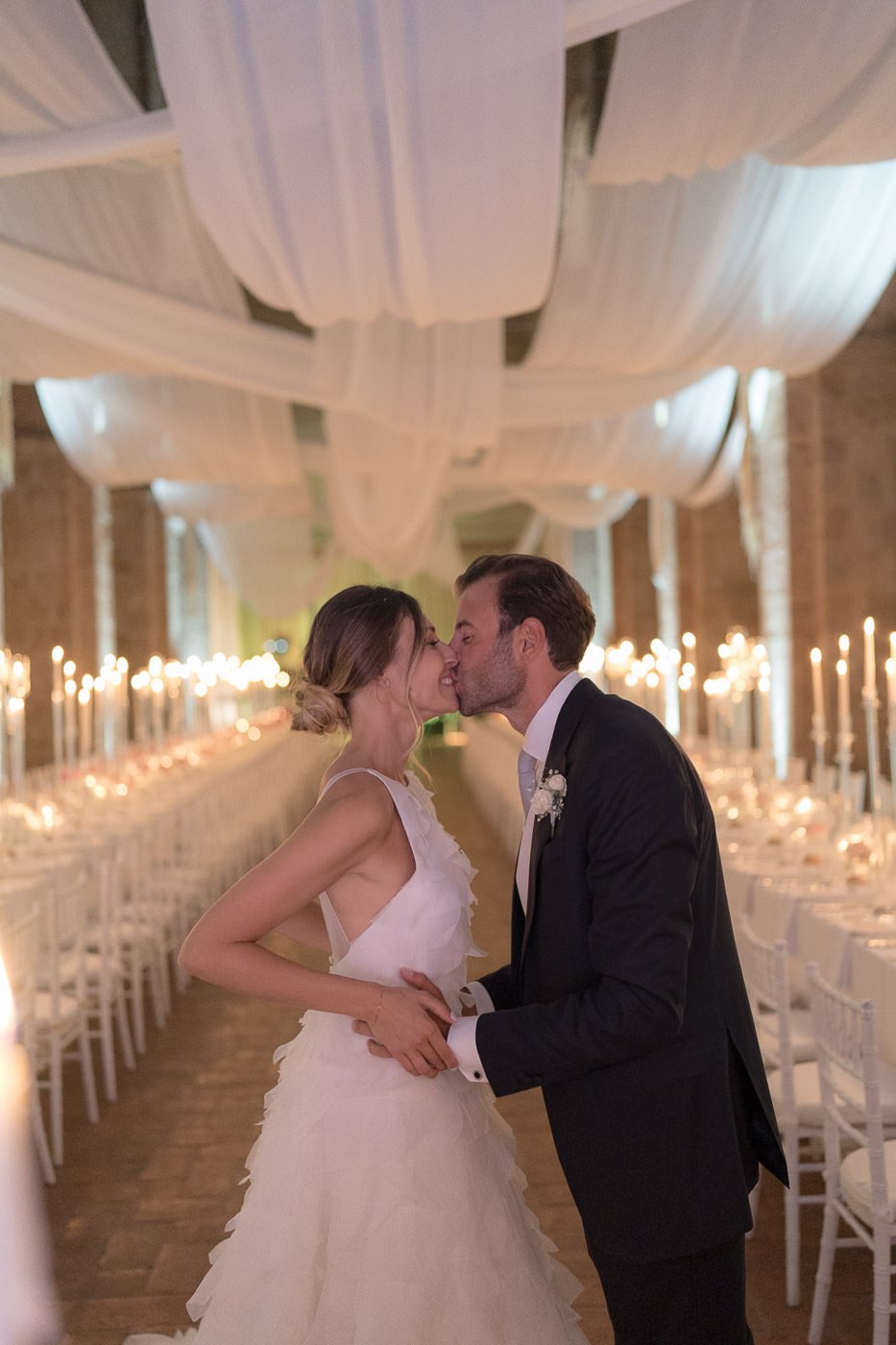 Uno dei momenti più suggestivi è stato senza dubbio la cena. Invece di svolgersi all’aperto, si è tenuta all’interno della grande chiesa dell’abbazia, uno spazio che ha reso l’esperienza ancora più speciale. L’ambiente ampio e imponente ha creato un’atmosfera unica ed è stato perfetto per accogliere tutti gli invitati in modo confortevole. Condividere la cena in un luogo così ricco di storia e significato ha aggiunto un ulteriore livello di emozione al matrimonio all’Abbazia di San Pastore di Valentina e Stefano.