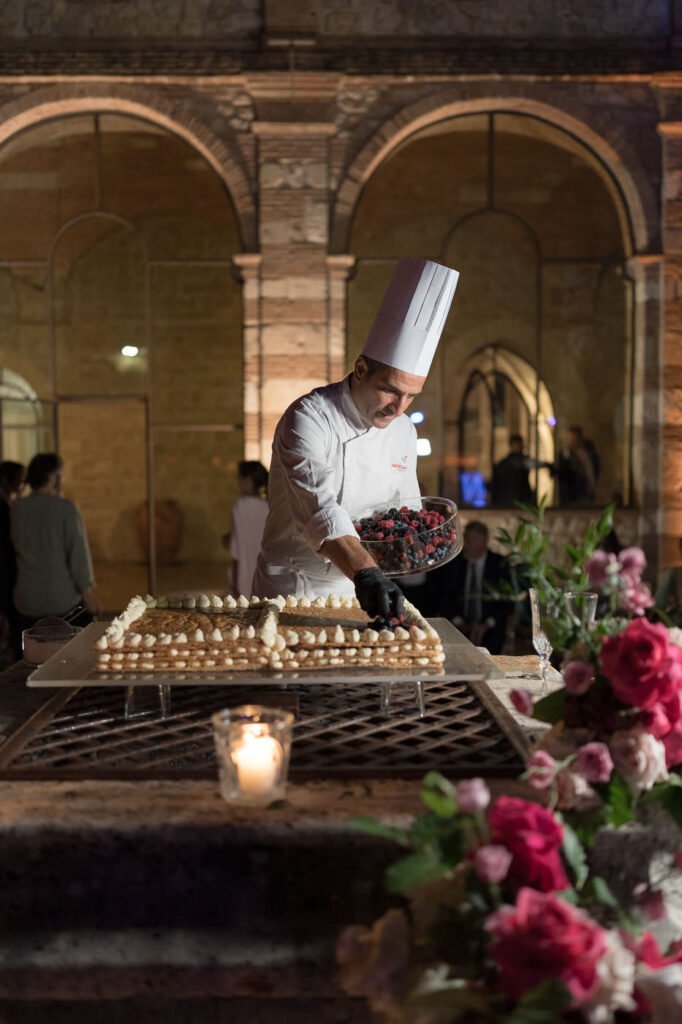 One of the highlights came at dinner time. Instead of being outdoors, the dinner took place inside the large church of the abbey, a space that made the experience even more special. The wide, impressive room created a unique atmosphere for the meal and worked perfectly for hosting all the guests comfortably. Sharing dinner in such a meaningful place added an extra layer of emotion to the day.